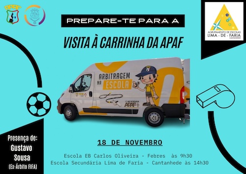 Publicado em: 2025-12-18No âmbito do projeto de angariação de novos árbitros, "Arbitragem na Escola", a APAF - Associação Portuguesa de Árbitros de Futebol e a Associação de Futebol de Coimbra, visitaram com uma carrinha o nosso agrupamento de escolas, ECO em Febres, Sec. de Cantanhede, no dia 18 de novembro.