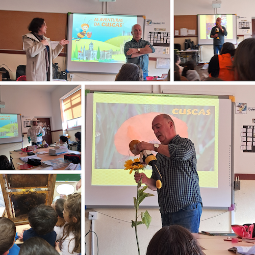 Paulo Santos, que é também apicultor, partilhou connosco a vida das abelhas, elucidando o seu habitat, os seus hábitos alimentares e a dedicação necessária para o seu cuidado. A abordagem do autor permitiu às crianças compreenderem a importância das abelhas como polinizadoras, elemento fundamental para a manutenção da biodiversidade e a sustentabilidade do nosso planeta.