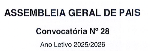 Publicado em: 2025-11-11Publica-se a convocatória para a Assembleia Geral de Pais para o Conselho Geral do Agrupamento.