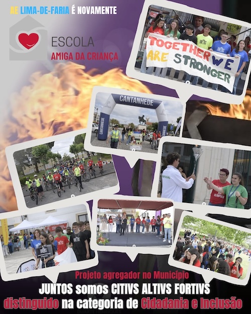 Publicado em: 2026-02-19O Projeto agregador "JUNTOS somos CITIVS ALTIVS FORTIVS", desenvolvido pelo Agrupamento com a parceria do Município, com a participação de mais de 1200 alunos, professores e auxiliares das escolas do concelho, com a colaboração de muitas Juntas de Freguesia, Comité Olimpico de Portugal - Educação Olímpica, núcleo do Centro da Liga Portuguesa contra o Cancro, Associação Acreditar e Desporto Escolar - CLDE Coimbra, foi distinguido como ESCOLA AMIGA DA CRIANÇA, na categoria Cidadania e Inclusão.