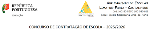 Publicado em: 2026-03-27Informam-se os interessados que está aberto o concurso de Contratação de Escola, na aplicação SIGRHE, para suprir necessidades de serviço docente, como descrito no ficheiro que pode ser consultado acedendo a "Ver Mais".